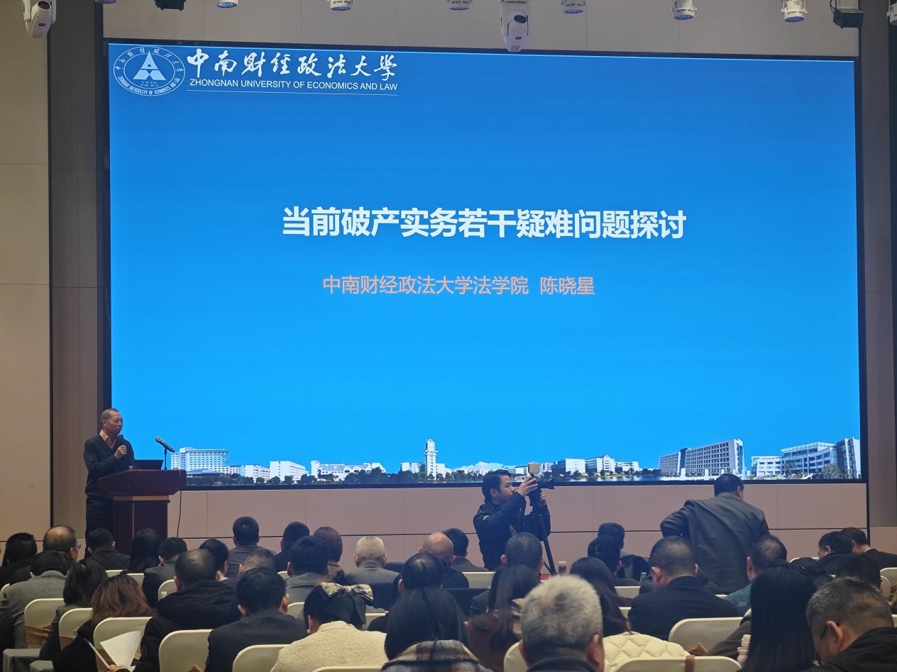中南财经政法大学副教授、湖北省破产法学研究会副会长陈晓星,以《破产重整疑难问题研究》为题,从“重整计划执行的终止规则、重整融资债权清偿的优先性问题、重整程序中的债权补充申报、破产企业对外股权处置的困境与破解、公司法出资制度改革对管理人追缴出资的影响、破产债权表确认裁定的法律效力、破产“配合清算义务人”的法律责任、重整程序与清算程序和解程序的启动与转换”八个方面进行授课讲解。